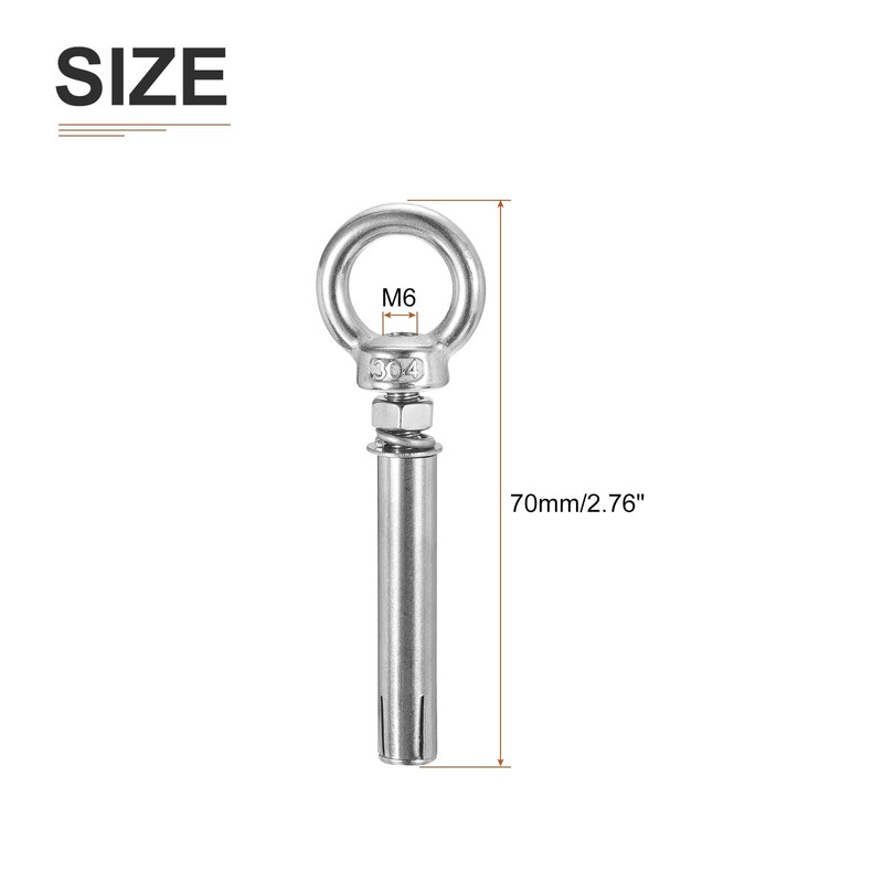 - [Expansion Eye Bolts] - The package comes with 5pcs of silver 304 stainless steel expansion bolts in nut size M6 x 70, thread diameter: 6mm/0.24", total length: 70mm/2.76", nut size: 10.8x5.5mm/0.43x0.22" (Across Flats D*T), pre-drilled hole diameter: 16", installation torque: 5Ft/Lbs.