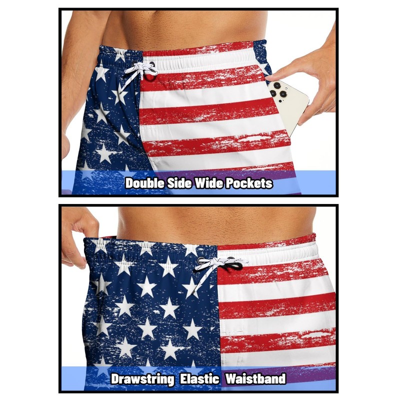 • 2 in 1 Swim Trunks Men Compression Liner:Men's American Flag swim trunks of excellent fabric, which is made of polyester and spandex.American Flag swimming shorts has quick-dry, breathable, lightweight and 4-way stretch features.The American Flag swim trunks with compression lining are durable and sun protective,The Spandex stretch lining is soft, skin-friendly, and breathable.The anti-chafe compression liner protects your skin from scratching.You won’t feel tight or insecure in these 2 in 1 sw