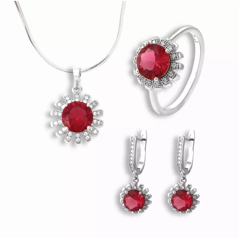 Elegante set de 3 piezas de joyería collar, aretes y anillo rojo rubí de importación chapada en oro blanco de alta calidad.
