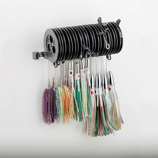 Storing your trolling lures and leaders has never been easier. You can now avoid those tangled messes that cost you fish and frustration. Easy enough for a beginner to use, but effective enough for a pro. Simply put the hook into the hook keeper, wind the leader onto the spool, push the rubber wedge onto hold the leader on the spool and hang on the track. Great for keeping your rigs at fingertips reach while keeping your boat neat, safe and organized.(12/pkg.) Mounts with suction cups (included) or screws.