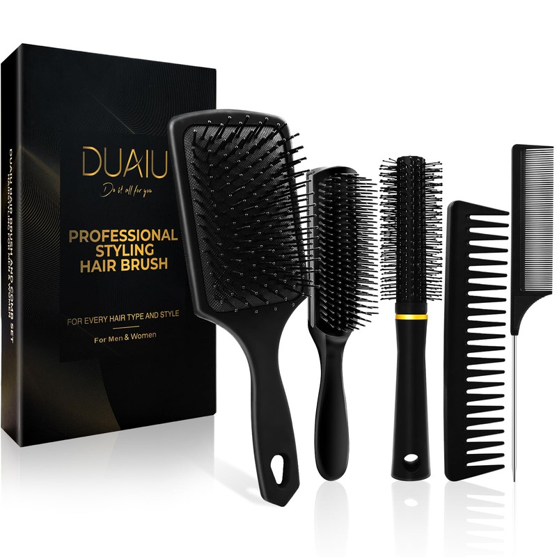 - EVERYTHING YOU NEED FOR DAILY HAIR CARE AND STYLING: Looking to detangle, add shine, or shape your style? This all-in-one 5pcs hair brush and comb set covers all your grooming needs. It includes a Air-Cushion Paddle brush, 9-Row brush, Round Quiff brush, Wide-tooth comb, and rat-tail comb - your one-stop kit for daily maintenance, styling, and beard grooming.