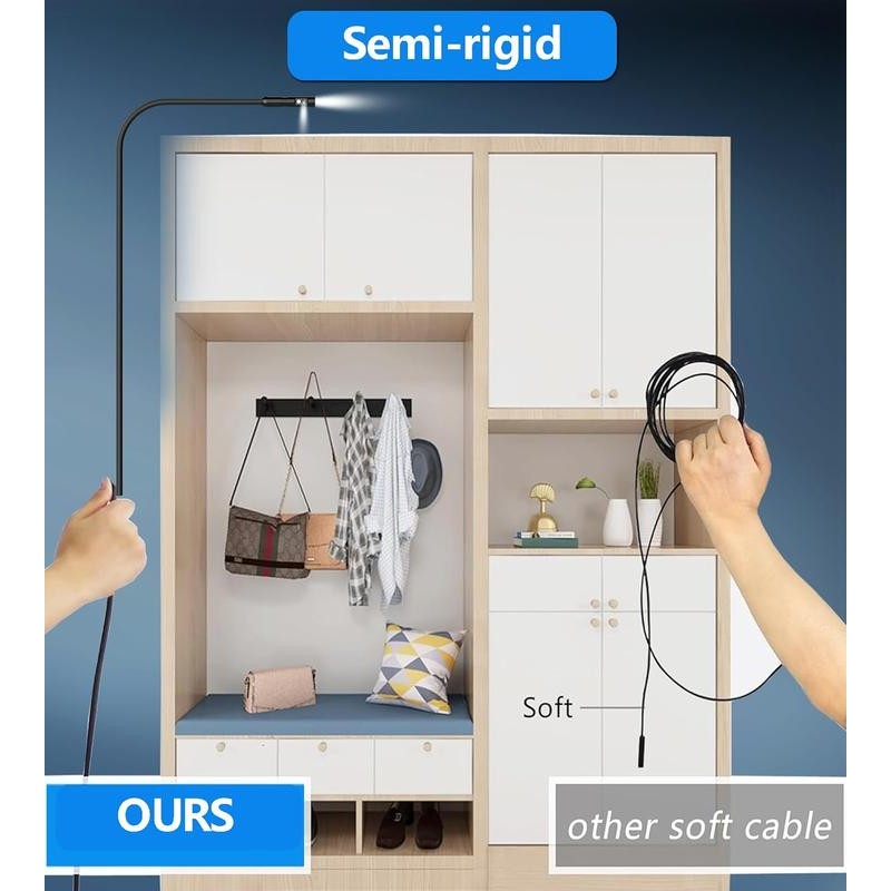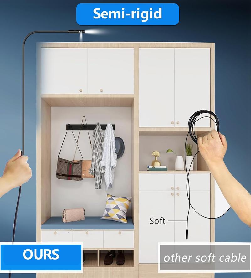 - 16.4 ft semi-rigid cable: 8.0mm Semi-rigid probe and semi-rigid cable that can be forwarded to the narrower place more easily. we can use this endoscope in many hard-to-reach, narrow, and confined places, this can do most of what mechanics and pros would need for short insertion, close up viewing of engine cylinder, valves, piston, spark plugs, diesel, electrical work inside wall, ac pipe, machine fix, etc. It also can be used for vent pipe, air conditioners, sofa corners, bathtub pipes, toilets, etc.