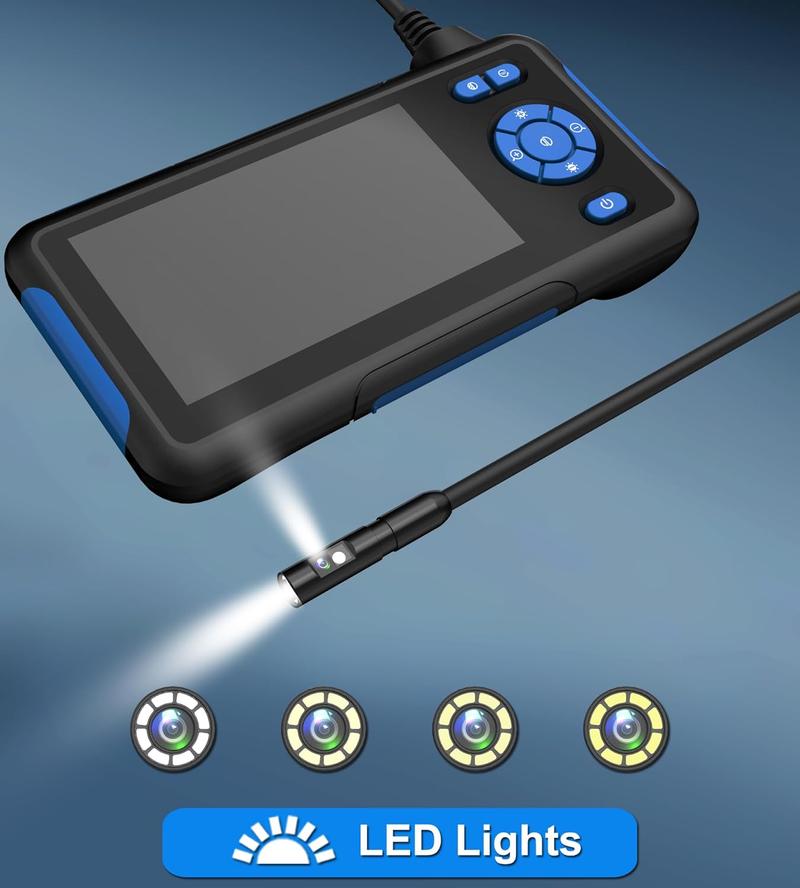 Dual Lens Industrial Endoscope, 1080P Digital Borescope Inspection Camera, 8.0mm IP67 Waterproof, with 4.3" LCD Screen Display, 8 LED Lights,16.5FT Semi-Rigid Cable (All Black)