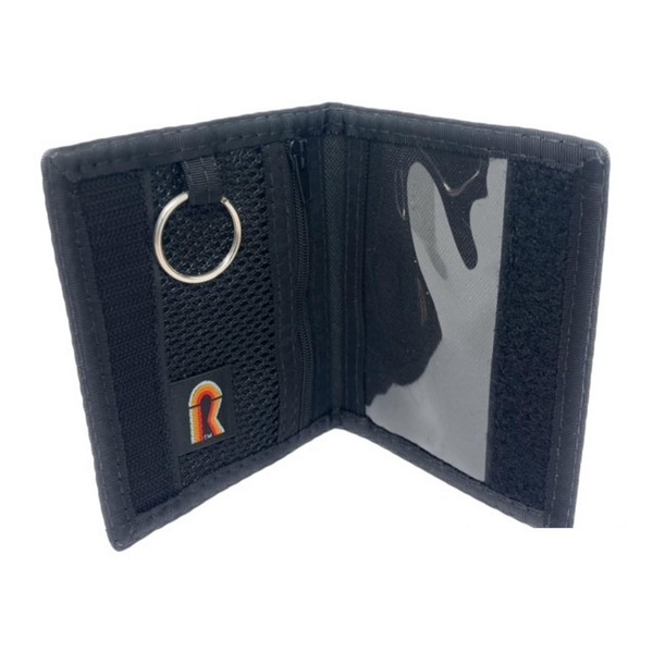 4 7/8 Inch (H) x 3 1/2 Inch (W) x 7 1/8 Inch Open Width. 3 Clear ID windows. 2 outside & 1 inside. Mesh pocket on the Inside holds Cash, Credit Cards, etc. Keyring, Secure hook and loop Closure. Lightweight and Water Resistant. Double Stitched for Added Strength. Made in USA by Rainbow of California.