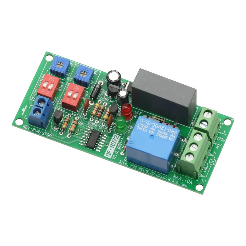 Connect a momentary push-button switch and press it, then green LED lights up indicating it is working. The board would automatically run according to the setting run time and stop time, infinite cycle.Press the start button again, then red LED lights up indicating it stops.