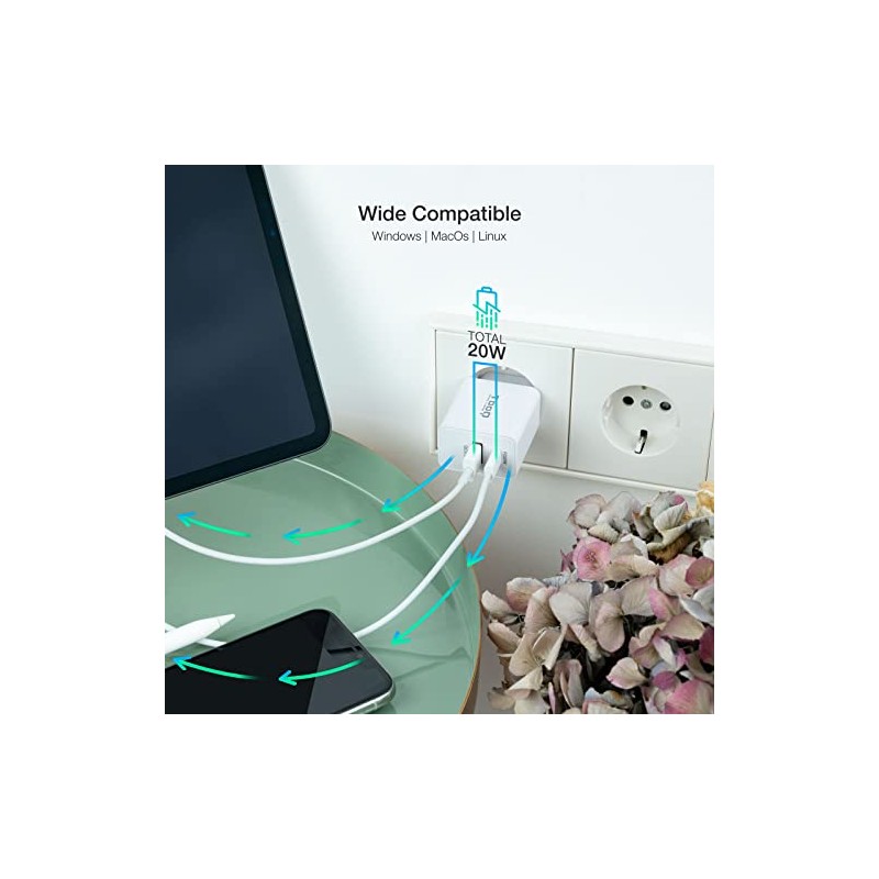 - The dual wall charger features a 20W USB-C power delivery port and allows fast and efficient charging for mobile devices. The elegant white color complements any environment, making it a practical and modern choice to keep your devices always ready. Designed to provide a safe and fast charging experience, it is the ideal addition to your gadgets.