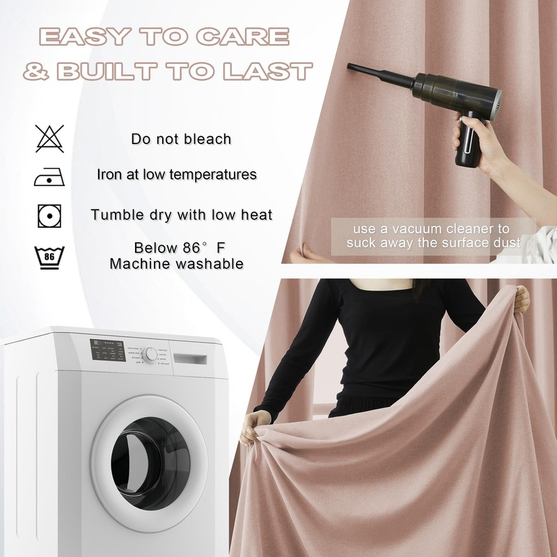 - Easy Care: Machine wash cold. Gentle cycle. Do not bleach. Use a vacuum cleaner to clean the surface of the curtains to prevent the accumulation of dust. Steam iron from back when needed. Iron at low temperature. Do not iron on the inner black film of the curtains, to avoid unnecessary misunderstanding.
