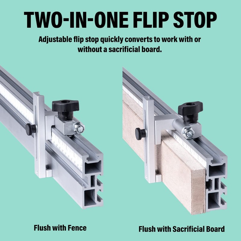 - PREMIUM: The corrosion resistant aluminum flip stop, a patent-pending invention, possesses a heavy-duty construction for long-term durability, intended to withstand the scratches and abrasive nature of woodworking applications.
