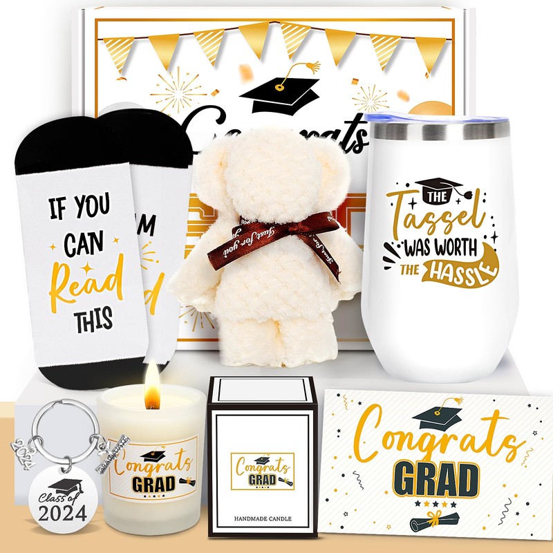 - Practical Graduation Gifts- This college student graduation gift set contains carefully designed items for every graduate. includes a 16OZ travel tumbler, bear towel, jasmine-scented candles, a keychain, cotton socks, and beautiful greeting cards. These come in a gift box. Write your sincere greetings on the gift card, and send this Best Graduation Gift to make her/him filled with so much love & care!