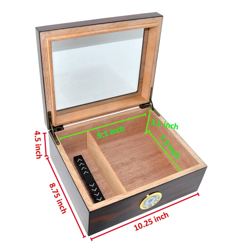 - Approximate Humidor Dimensions: Overall Exterior size: 10.25" W x 8.75" D x 4.5" H inch (26 cm x 22.2 cm x 11.4 cm). Interior: 9.12" W x 7.5" D x 3.12" H inch (23.1 cm x 19 cm x 8 cm). Removable cedar divider help you fix the cigars in box.