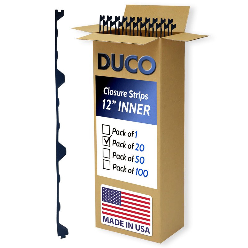 - FITTED – Duco’s rigid foam closures insert perfectly into their respective metal panels or other materials of the same profile and offer an interlocking dovetail design. Their weather-tight insulation helps seal out wind, birds, pests, or any rodent and provides water proof support on any buildings such as a greenhouse, barn, home, shed, cabin, house, warehouse, etc.