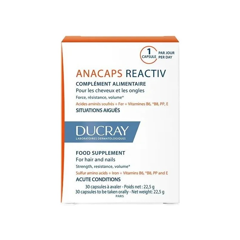 Anacaps Activ+ de Ducray es un suplemento alimenticio capilar formulado científicamente para ayudar a reducir la caída del cabello, fortalecer el folículo piloso y revitalizar el cabello desde la raíz. Contiene ingredientes esenciales como biotina, hierro, zinc, selenio y vitaminas del grupo B (B2, B3, B5, B6 y B8) que actúan en sinergia para restaurar el equilibrio nutricional y mejorar el ciclo natural de crecimiento capilar.