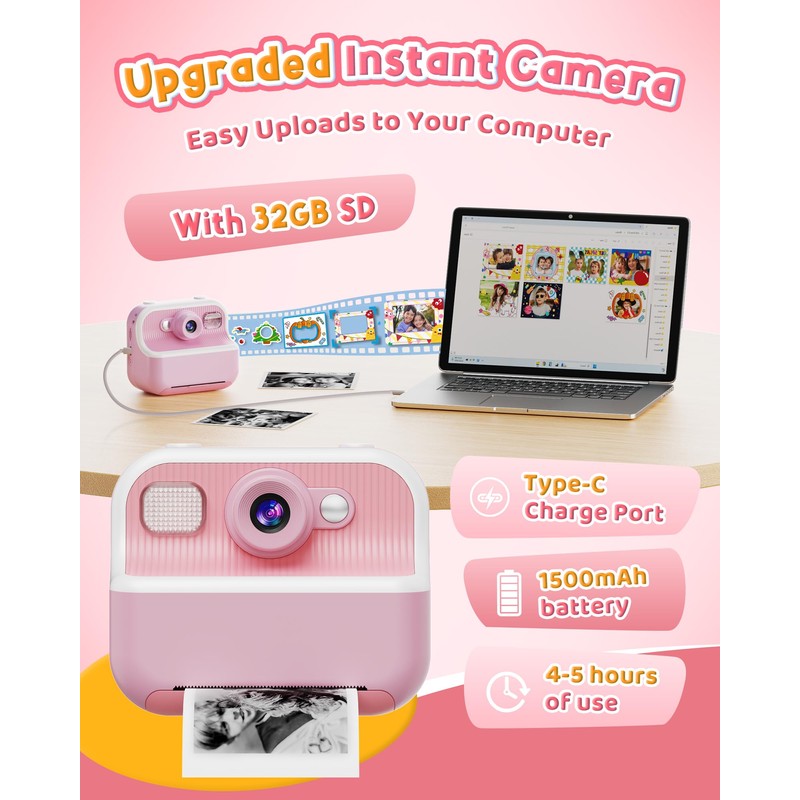 - Children's Instant Print Camera: Capture fun experiences with dual front and rear cameras! Print black-and-white photos in just 1 second, while color images save to the 32GB SD card. With 20 frames and 7 filters, this camera sparks creativity and transforms snapshots into cherished keepsakes