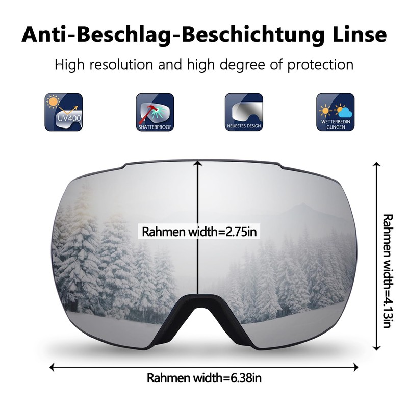 - Professional ventilation – Our snowboard goggles two-way ventilation system designed to reduce fogging and optimises the flowing air over the inside of the lens. Snowboard ski goggles provide smooth airflow system that brings fresh air and exhaust moisture quickly and effectively when snow skiing, snow skiing, snowmobiling, alpine skiing.