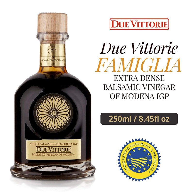 Rich Sensory Experience Due Vittorie Balsamic Vinegar is one of the most versatile ingredients. Famiglia is a gourmet vinegar with a unique round and clear flavor, both sweet and sour. It has a velvety consistency, with a clear and bright, deep brown color. The aroma is persistent, intense and delicate, with pleasant hints of acidity and a slightly woody scent. This comes from using just two ingredients: cooked grape must and wine vinegar. We do not add any colorants or preservatives and there are no allergens or sulfites present. Our Aceto Balsamico di Modena IGP is gluten-free. Our balsamic vinegar can be used in multiple ways. As a salad dressing or a dip for freshly baked bread. Dress up veggies or drizzle over bruschetta and pizza. Try topping ice cream to take it up a notch!