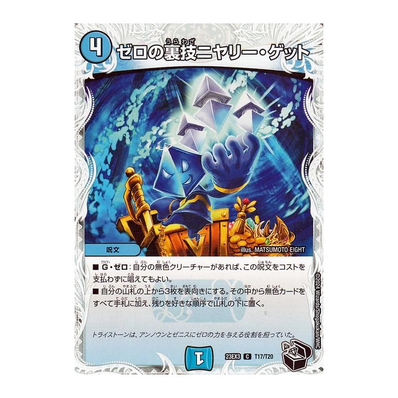 Duel Masters TCG Abis Revolution Gaiden "Evil God and Crystal Flower" (DM23-EX3) Recording; Card Name: Niyare Get, Zero Trick; Rarity: Zenith Black Treasure; Type: Spell; Civilization: Crystal Civilization; Cost: (4) [Special Ability] ■G Zero : In the Battle Zone. If you have a colorless creature, you can recite this spell without paying a cost. ■ Turn 3 cards face up from the top of your deck. Add all colorless cards to your hand and place the rest on the bottom of your deck in any order.