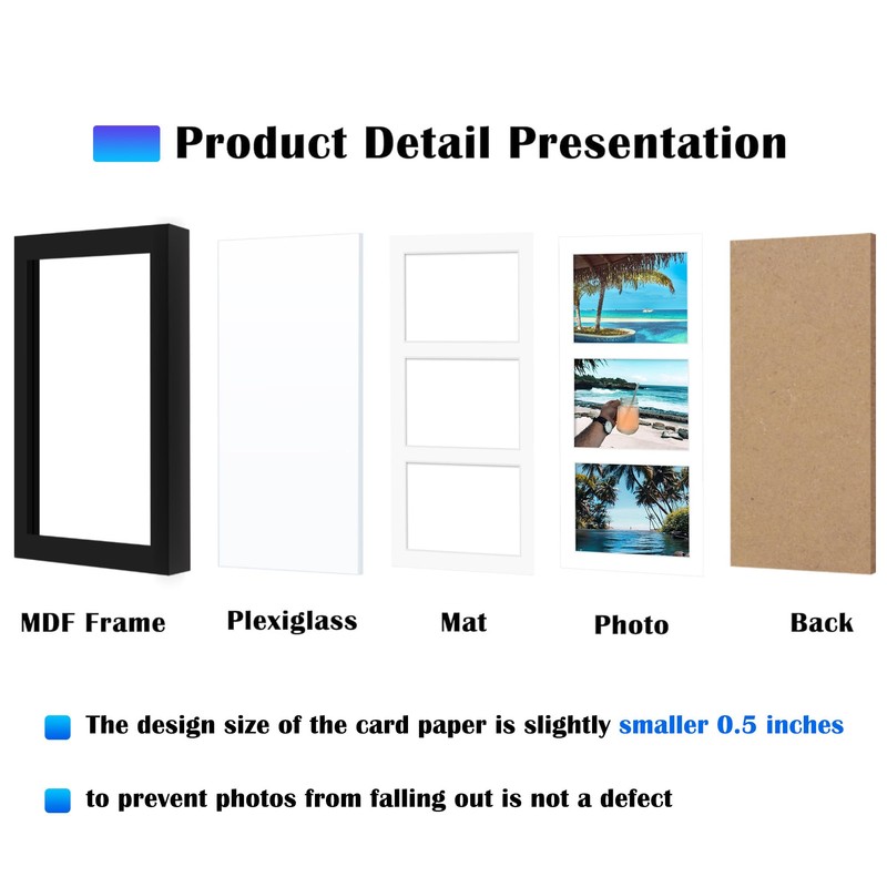 - Multifunctional display: The frame with opening mat is more suitable for three 4x6 inch photo display, if you don't use mat, you can use it as a matless 8x14 photo display.
