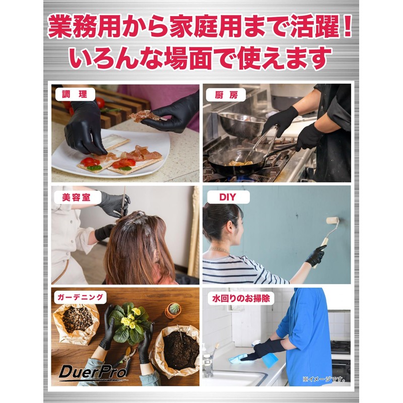 - ✅【様々なシーンで活躍】DuerProのニトリル手袋は汎用性抜群!食品加工、検品作業、掃除、歯科治療、水回りの掃除、ガーデニングなど様々なシーンで活躍!純正ニトリル素材の特性上、耐油性耐薬品性にも優れているため油や薬品を使用するシーンでも利用することができます!※爪先、刃物や尖った物等で傷をつけないようご注意下さい。高濃度の薬品や溶剤(ガソリン、ベンジン等)を長時間使用しないで下さい。
