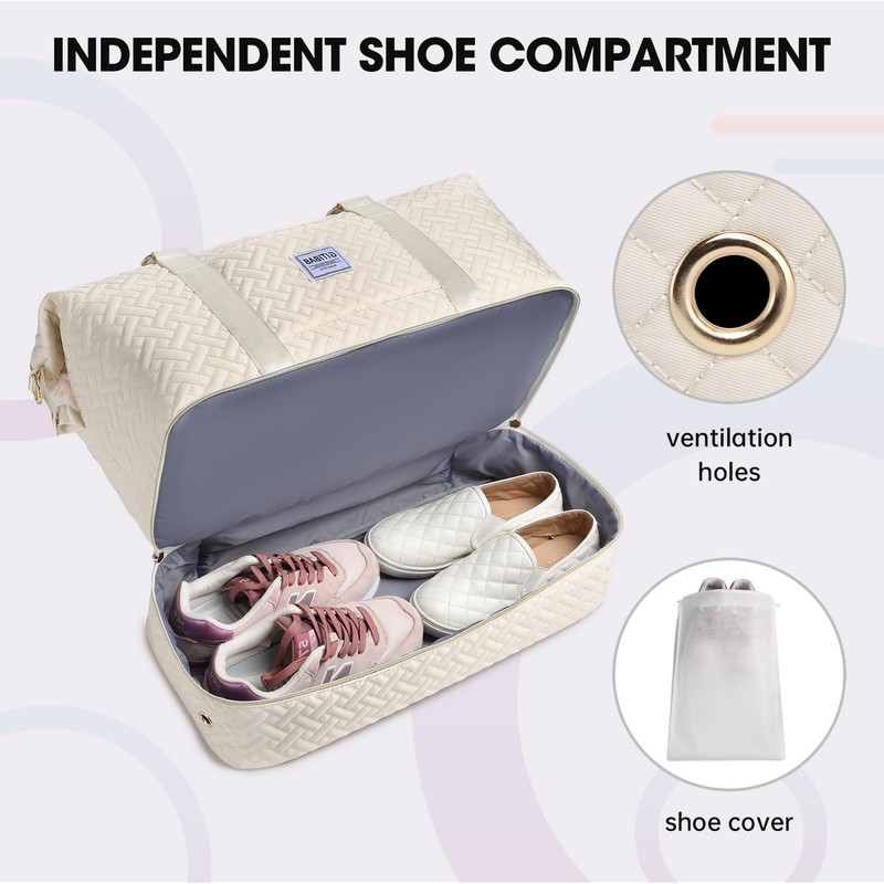 Duffle Bags for women,50L Quilted Travel Weekender Bag with Shoe Compartment, Large Carry On Overnight Tote Gym Bag,Hospital Bags for Labor and Delivery,Beige