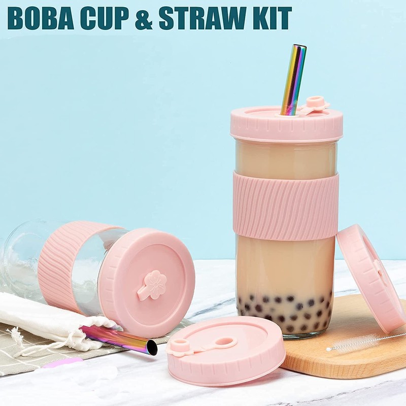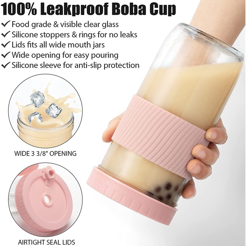 - WIDE MOUTH DESIGN & USER FRIENDLY The wide mouth glass cups allow you to pour juices, smoothies and cheese directly into the glass, and smoothies, bubble tea drinks, iced coffee easily more. We have different lids are suitable for different purposes, storage jars or drinking cups, you no longer have to worry about not finding a suitable lid. Anti-slip silicone case also protects your hand from temperature burning, no need to worry hot coffee, hot tea and more.
