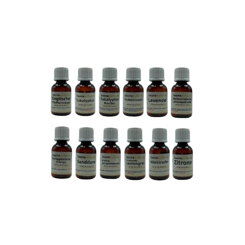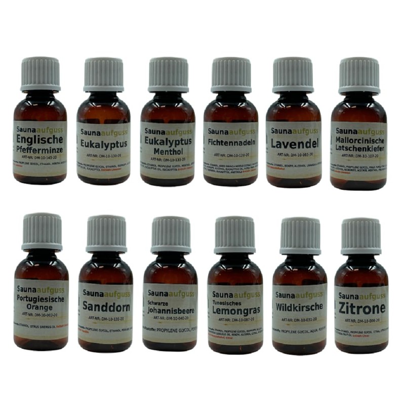 - Our classics in one set (12 x 20ml): English peppermint, eucalyptus, eucalyptus menthol, spruce needles, lavender, Mallorcin mountain pine, Portuguese orange, sea buckthorn, blackcurrant, Tunisian lemongrass, wild cherry, lemon