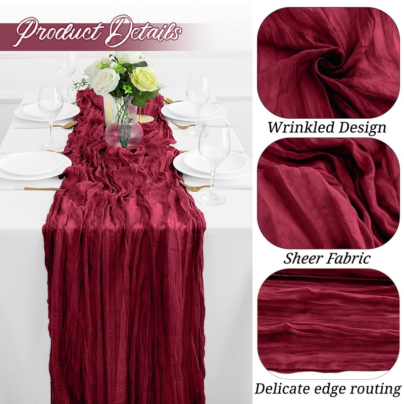 • High Quality Material: Our burgundy table runner is made of 100% natural cheesecloth fabric, with beautiful pleats, delicate and elegant, full of beauty. Soft to the touch, durable and reusable. This boho table runner is translucent and naturally draped, elegantly hanging over your banquet table