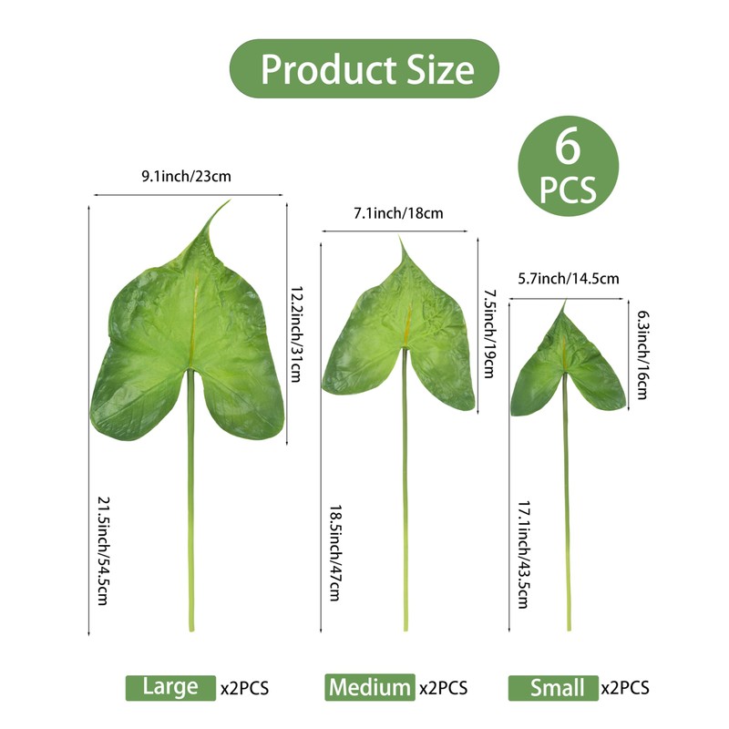 - [Value Pack]This set includes 6 artificial tropical leaves in varying sizes:2 Large (9.1" x 21.5"),2 Medium (7.1" x 18.5"),and 2 Small (5.7" x 17.1").These lightweight faux leaves are easy to arrange and can be washed and reused for lasting beauty.