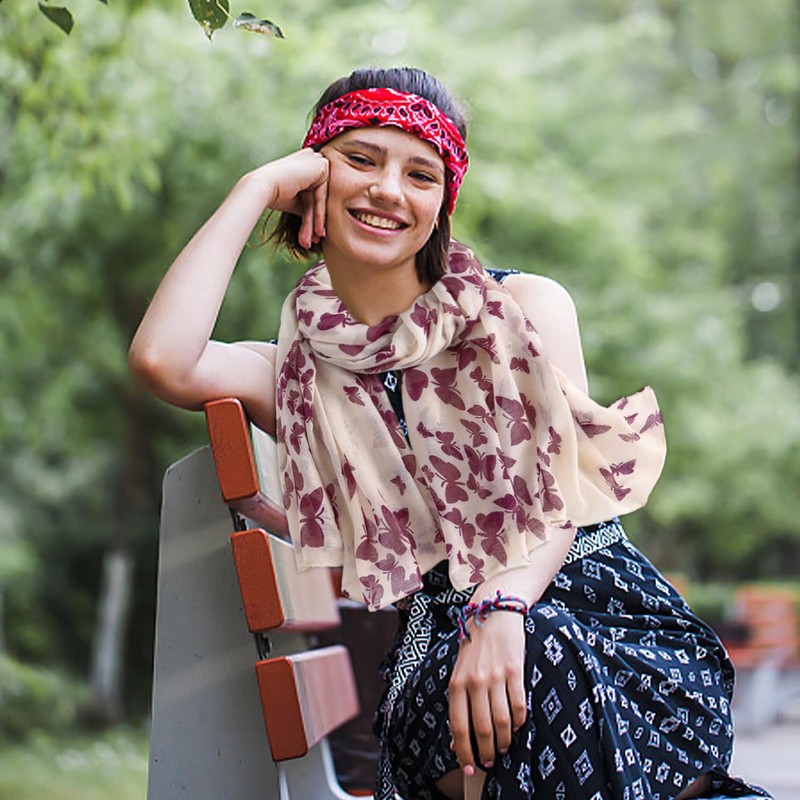 Our beautiful butterfly scarf in a tasteful beige color! Measuring 82 x 180 cm and weighing only 85 grams, it is light enough to carry around and suitable for a variety of occasions, from casual to formal events. Butterfly patterns add an air of elegance and sophistication to any outfit.