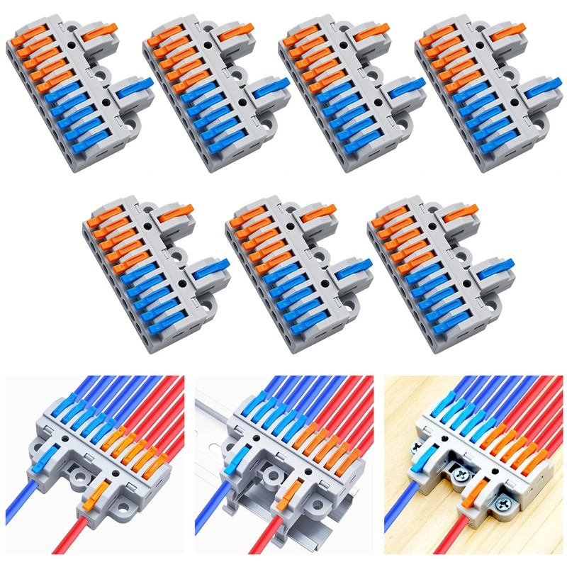 Dujelixa 2-in-10-out Terminal Block Kit (7 Pack), Lever Wire Connectors for Extensive Splicing, Dual Input to Ten Output, DIN Rail & Screw Mount, 28-12AWG, Hardware Included