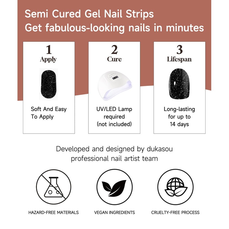 - 【Salon Quality Nails at Home in Minutes】No time to go to the salon? These semi-cured gel nail strips are easy to use, file, cure, and remove. Even beginners can get beautiful nails in minutes!