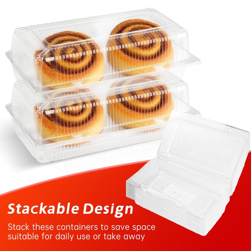 Get 20 transparent cinnamon roll containers with lids.Measuring 10 x 5.7 x 3.3 inches outside and 9.6 x 4.7 x 3.3 inches inside, they're made of lightweight plastic.Suitable for many foods in picnics or parties. Hinged latches seal tightly with a click. Note: Don't put items over 60 degrees or overfill