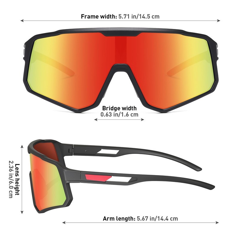 - Youth Sunglasses TR90 Frame - Crafted with lightweight and sturdy TR90 materials for a comfortable wear experience. We've tailored adult sunglasses to fit perfectly with the dimensions: Lens width: 2.85 inche; Lens height: 2.36 inche; Bridge width: 0.63 inche; Frame width: 5.71 inche; Arm length: 5.67 inches. If you have any questions about our cycling sunglasses, our DUKZURA customer service team is ready to assist you promptly.