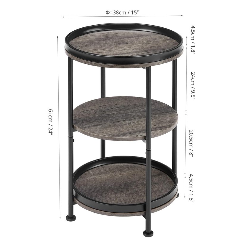 - 【ROUND SIDE TABLE】 Round Side Table Dimensions: 24'' H × 15'' L × 15'' W/61cm(H) *38cm(L) *38cm(W). Rustic end table with shelf,3 tiers design can help storage more essentials of your living room bedroom or office; Place coffee and vase on the tabletop and books on the shelf. Perfect for small spaces and small apartments.