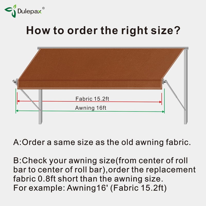 • HOW TO ORDER - Actual finished Fabric Measurement of 17'2" is fit for 18 FT RV Awning (BE CAREFULL on MEASURING: Measure the RV Awning using Center of Arm to Center of Arm), RV awning Sizes available:10', 11', 12', 13', 14', 15', 16', 17', 18', 19', 20', 21'