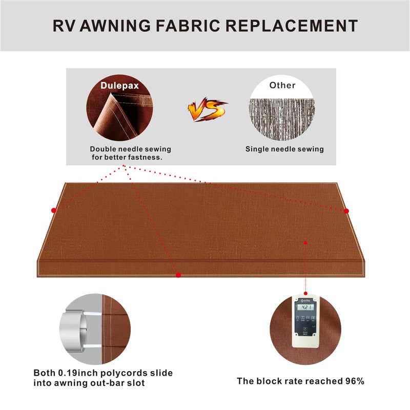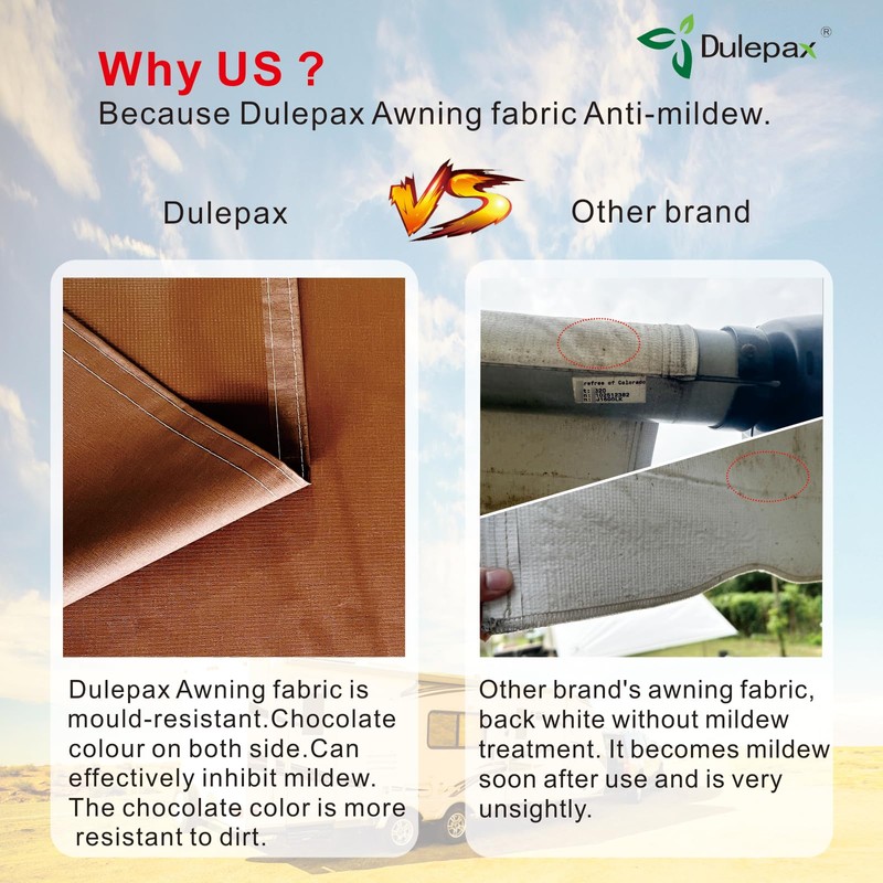 • RV AWNING FABRIC REPLACEMENT: Use Dulepax's high quality vinyl fabric with resistant design. This rv awning fabric is chocolate colored on both sides. Compared to the traditional awning with white bottom side, Dulepax awning fabric is more dirt resistant