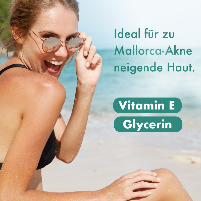 - Care formula – sun protection with vitamin E and glycerine is waterproof, moisturises 24 hours and is also suitable for skin prone to Mallorca acne