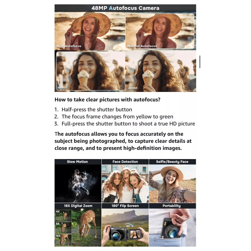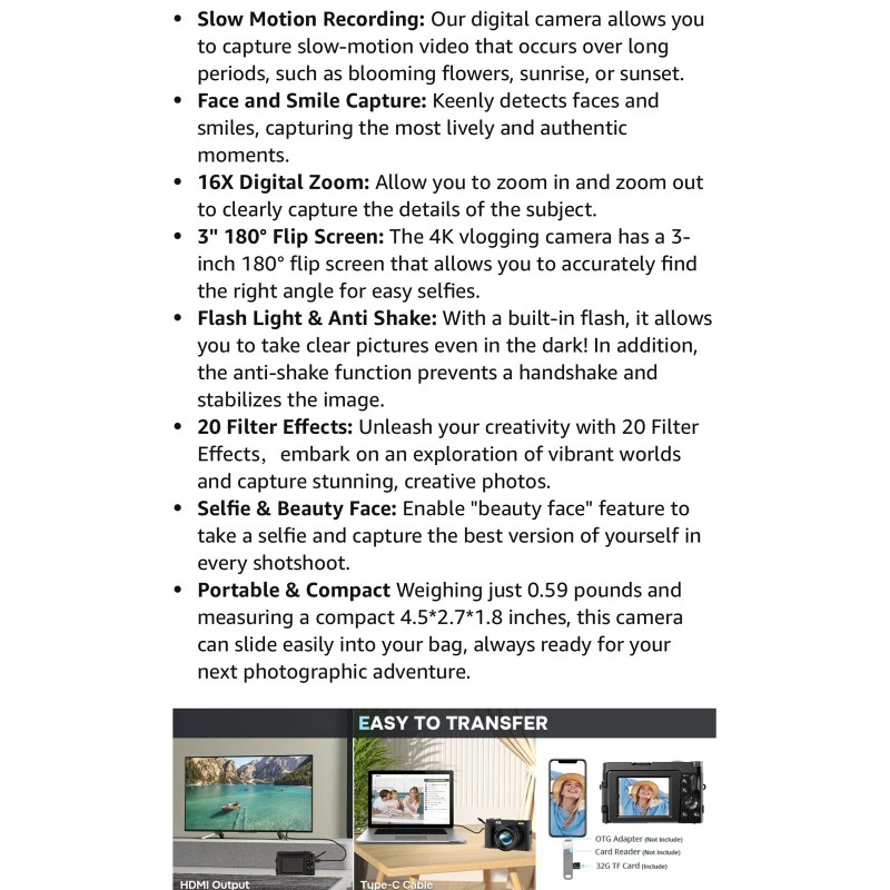 4K Digital Camera for Photography Autofocus, Upgraded 48MP Vlogging Camera for YouTube with SD Card, 3" 180 Flip Screen Compact Travel Camera with 16X Digital Zoom, Flash, Anti-Shake, 2 Batteries ❤️Great quality~ Please see pictures for more details. 🌟You get what you see~~ will ship out within 24 hours, 🚀Via USPS Priority Shipping~. Please check out my listing for more amazing items. happy shopping 🥳