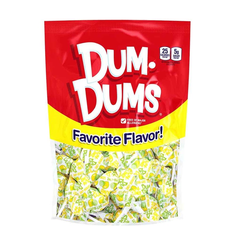 Buy Lemon Lime Dum Dums in the 1-50 ct bag to have plenty to share with family, friends and coworkers. Each bag contains about 50 pops.This Dum Dums flavor will have kids asking for more, making it the perfect addition to trick or treat bags, candy dishes or treat boxes. These lemon lime treats provide a small bit of sugar, allowing even strict dieters to indulge without the guilt. An American candy icon since 1924, Spangler Candy Dum Dums have no glutens or top common allergens, and are OU kosher certified. These small lollipops are individually wrapped in Dum Dums green, yellow and white colored wrap with its flavor printed on the wrapper.