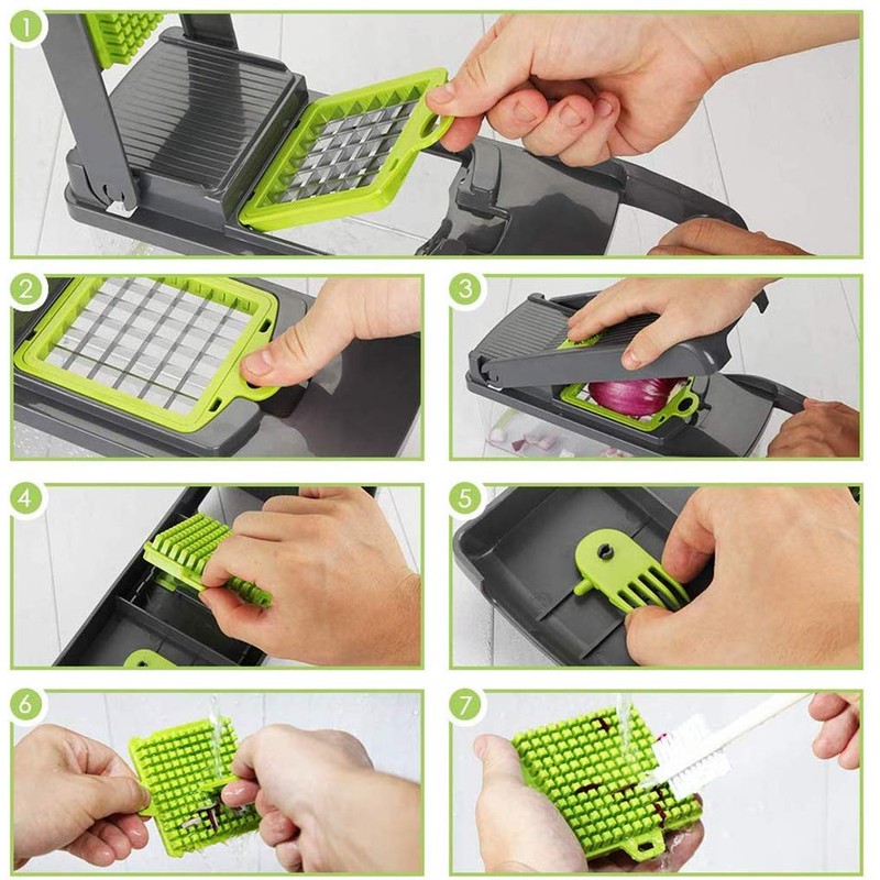 - 【Easy to Clean】All parts of our vegetable chopper can be disassembled easily for cleaning by hand wash, also can be used in the dishwasher (Bottom container boxes need to be hand washed, not dishwasher safe). Also it comes with a free cleaning brush for wiping food residue off the lid. Furthermore, all the blades can store in the vegetable chopper container well after cleaned.