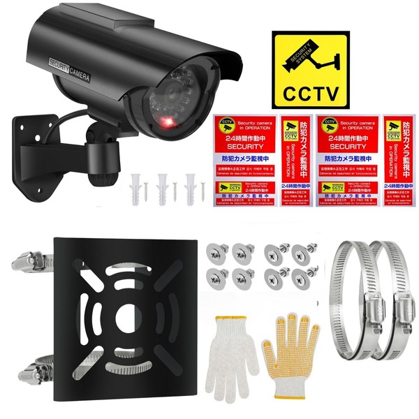 - (Set Contents) Dummy security camera, screws, 3 concrete plugs. Mounting hardware set. Set of 2 security stickers (1 set of 3 8.3 x 7.9 inches (21 x 20 cm). Yellow security camera sticker x 1, total of 7 pieces. Work gloves, instruction manual (English language not guaranteed)