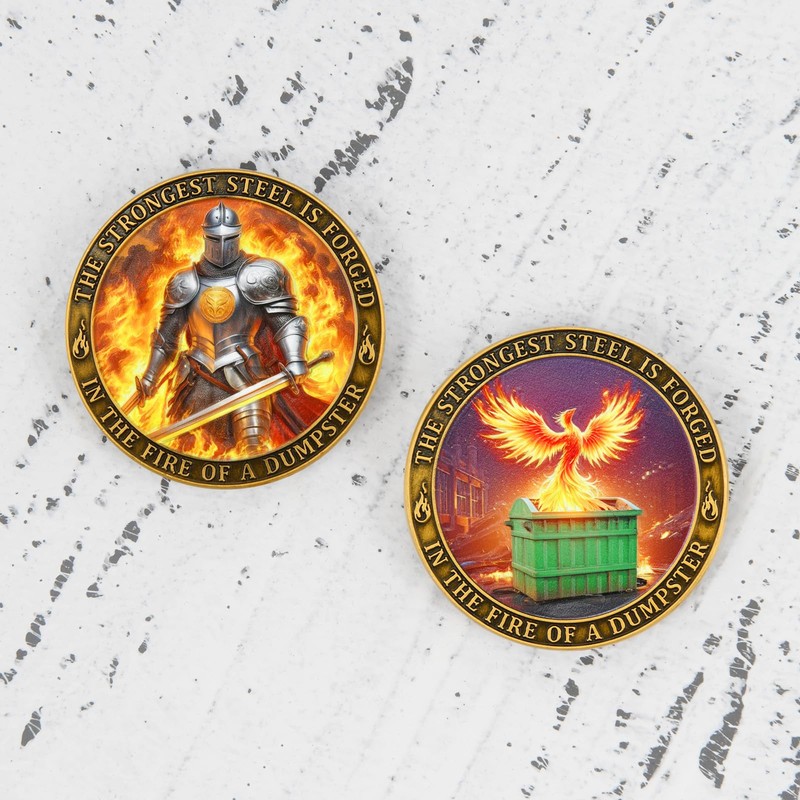 - Symbol of Resilience: This unique challenge coin features a phoenix rising from a dumpster fire, representing strength, renewal, and the ability to overcome adversity. The powerful imagery serves as a reminder that the strongest steel is forged in fire.
