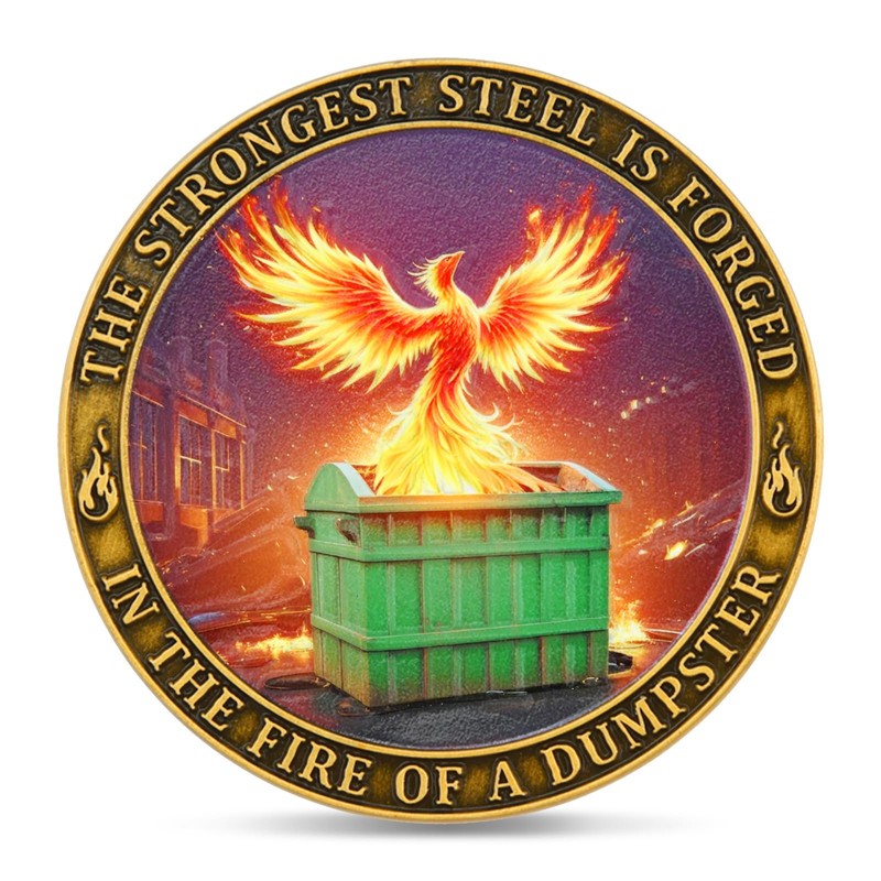 - Symbol of Resilience: This unique challenge coin features a phoenix rising from a dumpster fire, representing strength, renewal, and the ability to overcome adversity. The powerful imagery serves as a reminder that the strongest steel is forged in fire.