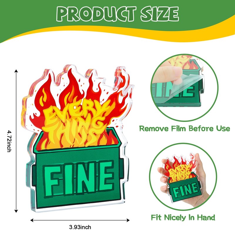 • ADD IRONIC HUMOR TO YOUR DESK: This acrylic sign showcases a striking "Dumpster on Fire" design with the phrase "Everything is fine," adding bold satire to your workspace