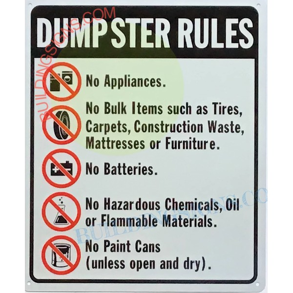 Dumpster Rules Sign (White, Reflective, Aluminum 10x12)