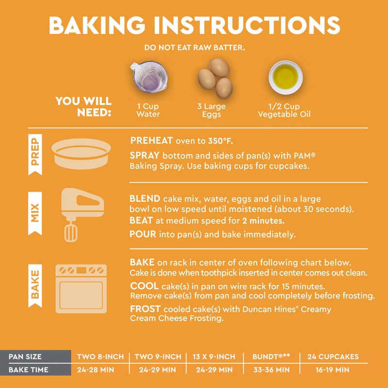 Create a delicious dessert with Duncan Hines Signature Perfectly Moist Orange Supreme Cake Mix. Flavor from real orange juice fills each bite of this soft, moist cake. Bake a layer cake or loaf cake for everyday desserts, or use the orange cake mix to make orange cupcakes. Combine the boxed cake mix with water, eggs and oil for simple prep. Bake according to package instructions based on your pan size. Each box makes enough cake batter for a 13 by 9 inch cake or 24 cupcakes. From decadent brownie mix, to single serve desserts, Duncan Hines has you covered when you’re ready to bake and create.