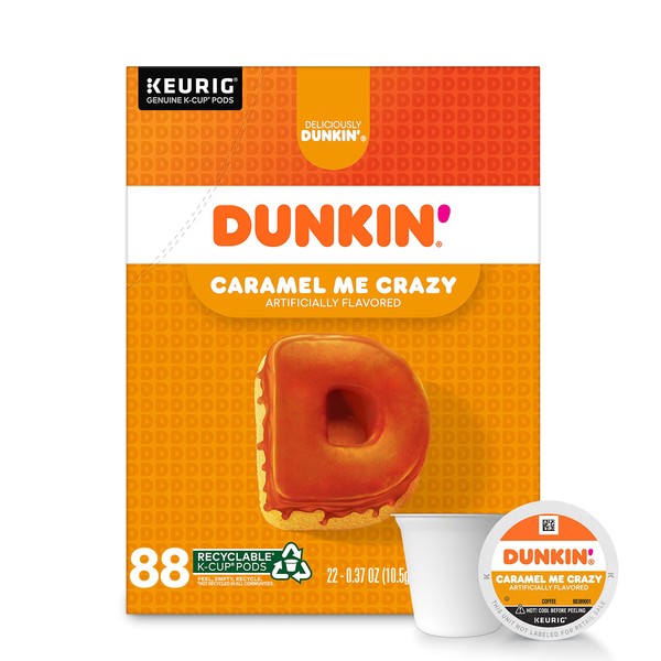 - Contains 4 boxes of 22 Dunkin' Caramel Me Crazy Flavored K Cup Pods (88 Count Total)