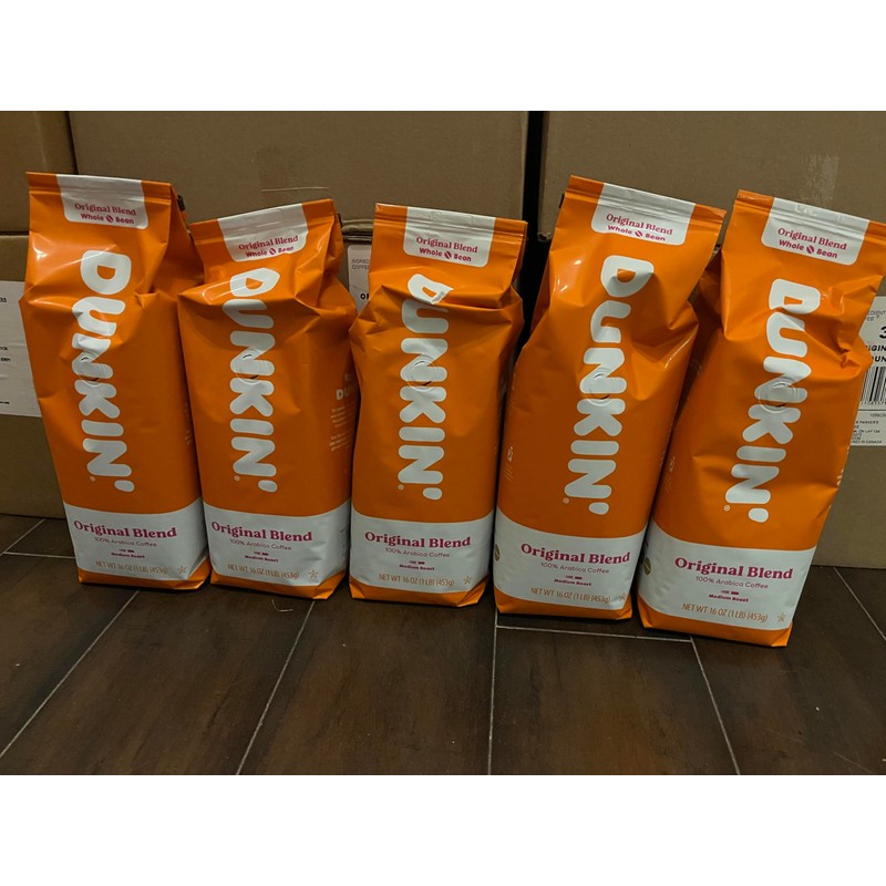 - Products: Dunkin Donuts Original Whole Coffee Bean 1 Pound Bag. Size: 1lb Per Pack Quantity : 5 Packs Total: 5 pcs 1lb Bag ( 5lb ). Each 1lb Pack Offers Freshness and Convenience. Ideal For Brewing With Various Methods. A Favorite among coffee enthusiasts for its consstent quality and taste. This coffee is made from 100% Arabica beans, known for their smooth and aromatic characteristics. The 1 lb packs are sealed to maintain the coffee's freshness over time. Great for both everyday enjoyment and special occasions. Dunkin Donuts is a well-known and trusted brand in the coffee industry.
