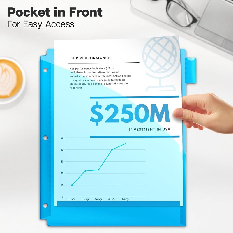 3-hole punched for standard binders, binder divider tabs with pockets include slash pockets to hold loose papers, flyers, assignments, homework or business presentations. 1/8-cut tabs make them perfect tab dividers with pockets for 3 ring binders.