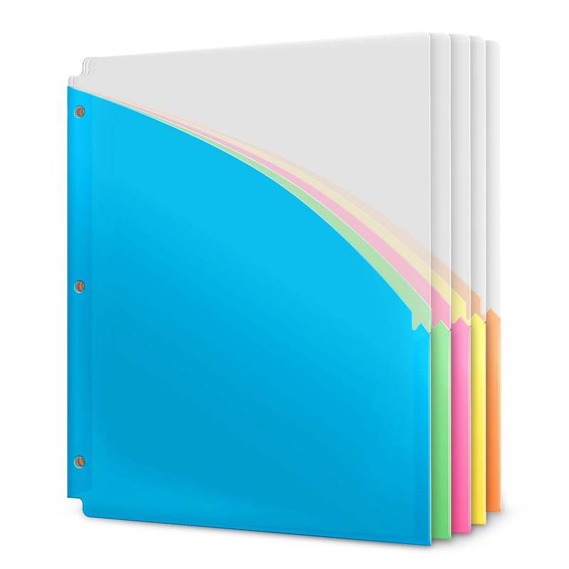 - Dunwell Plastic Project Jackets: (1 Set, 5 Count) 3-Hole Punched Plastic Dividers for 3-Ring Binders, 5 Vibrant Colors, Two-sided Slash Pockets.