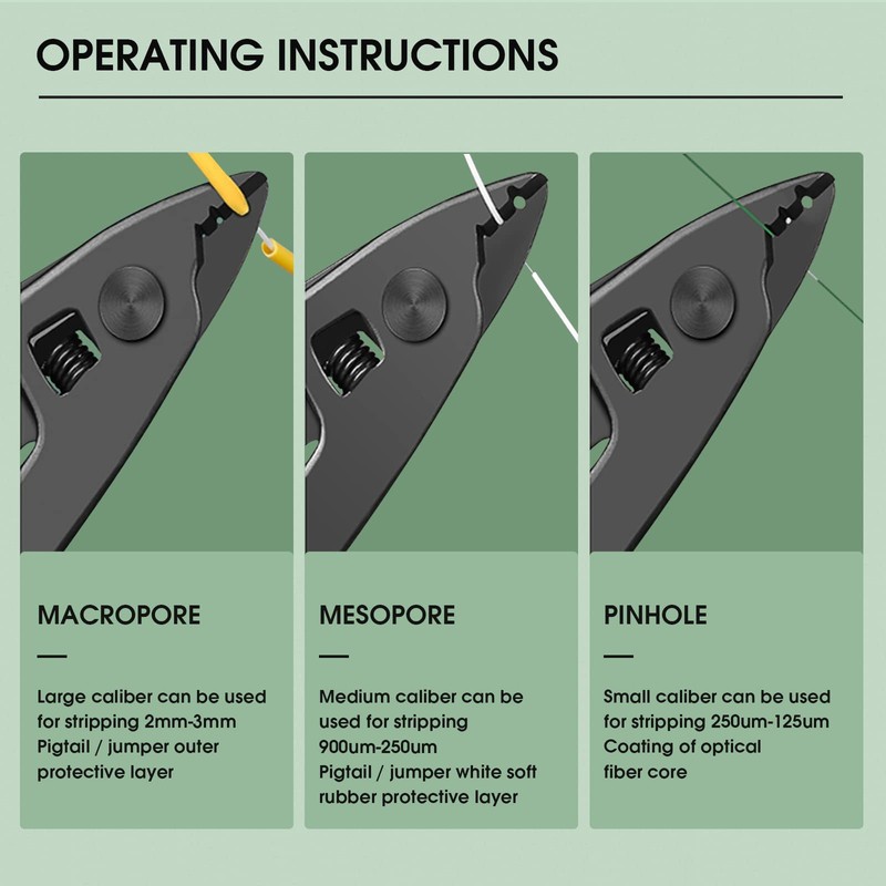 - 【Three-port design】Hole (1) 2 - 3 mm fiber jacket cuts down to the 600 - 900 micron buffer coating. Hole (2) strips the 600-900 micron buffer coating down to the 250 micron coating. Hole (3) cleanly strips the 250 micron cable down to the glass fiber.